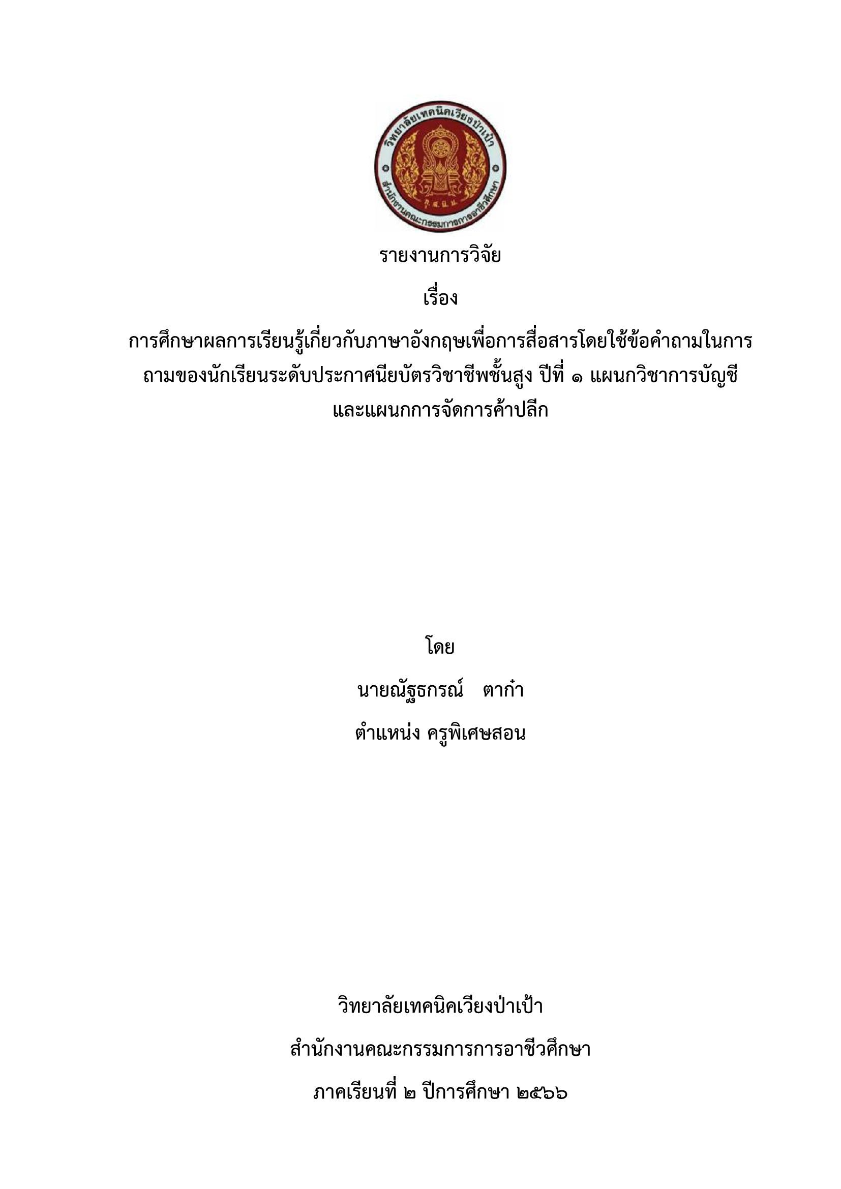 การศึกษาผลการเรียนรู้เกี่ยวกับภาษาอังกฤษเพื่อการสื่อสารโดยใช้ข้อคำถาม ปีการศึกษา 2566 โดย ณัฐธกรณ์ ตาก๋า